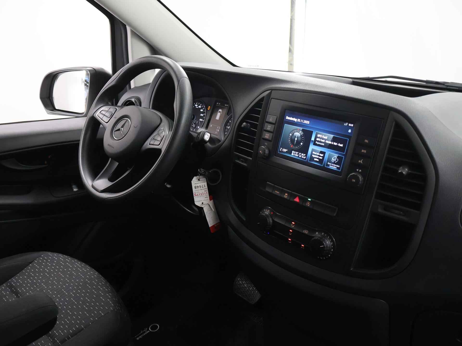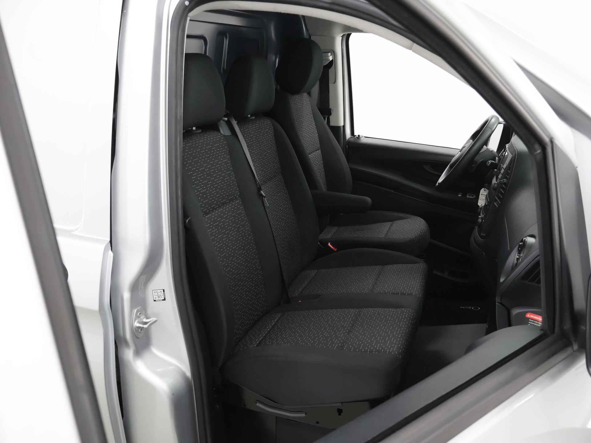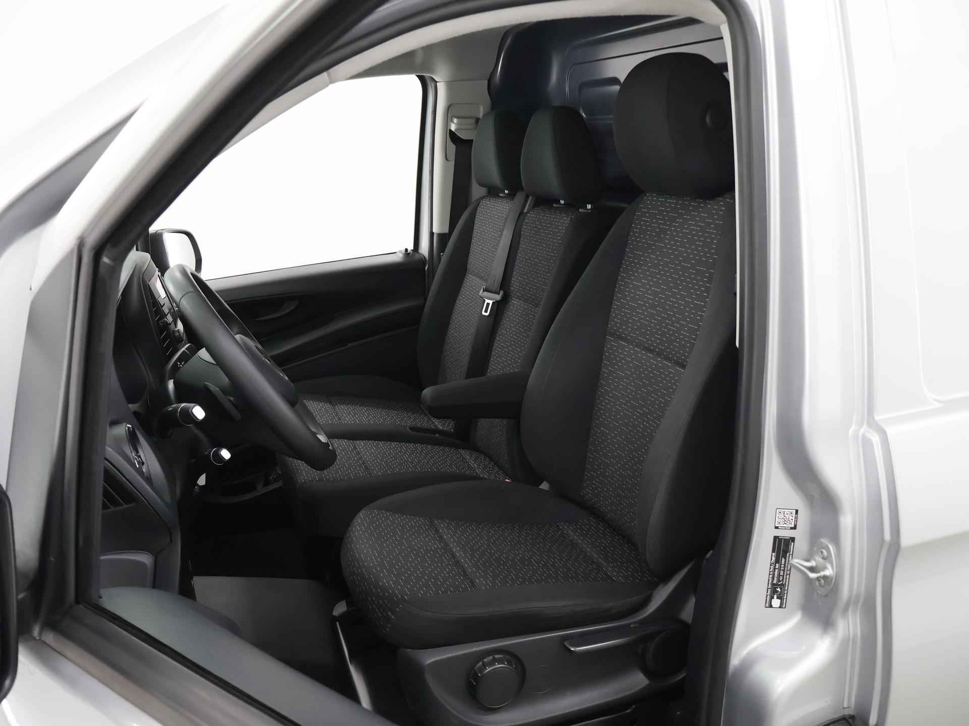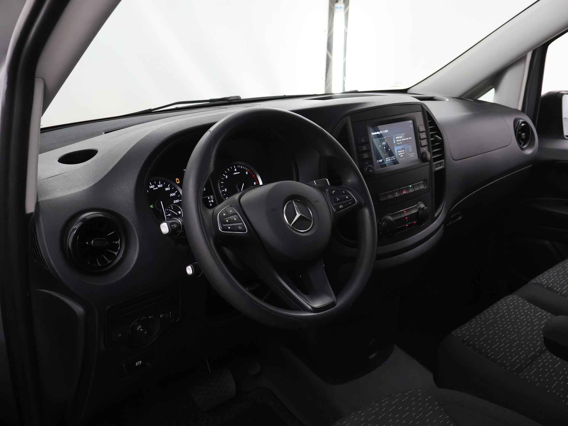 Zijn dynamische uiterlijk maakt al direct duidelijk wat voor rijervaring u van deze Mercedes-Benz Vito mag verwachten: pure sportiviteit. Met zijn dieselmotor en automatische transmissie is dit een prima auto voor nog vele kilometers. Prettig zitten maakt elke rit ontspannen dankzij de comfortstoelen. De schuifdeur bij het passagiersdeel is ook een voordeel: geen uitzwaaiende portieren en een royale instap. De uitmonstering van deze auto wordt gecompleteerd door onder meer warmtewerend glas en trailer assistent. Met behulp van de achteruitrijcamera kunt u zo strak inparkeren als u maar wilt! U kunt het audio-installatiesysteem bedienen met de knoppen op het stuur. Om de veiligheid onderweg te verhogen, heeft deze Mercedes-Benz zowel een automatisch inschakelbare verlichting als een regensensor aan boord, zodat hij zelf de verlichting en de ruitenwissers kan inschakelen. Er is ook cruise control aan boord, om met een constant tempo ontspannen en zuinig te rijden. Met één druk op de knop blaast de airconditioning een koele bries door het interieur. Deze auto is voorzien van centrale deurvergrendeling met afstandsbediening, boordcomputer en verstelbaar stuur. De Mercedes-Benz Vito is uw trouwe partner onderweg, want hij houdt continu voor u de situatie op en om de weg in de gaten. Volautomatische veiligheidssystemen kunnen daarbij ingrijpen om u voor gevaarlijke situaties te behoeden. De veiligheidssystemen in deze auto nemen het zelfs waar als de bestuurder tekenen van vermoeidheid vertoont, en waarschuwen dan met een duidelijk signaal. We laten u deze auto graag helemaal zien. Belt u ons voor een afspraak?