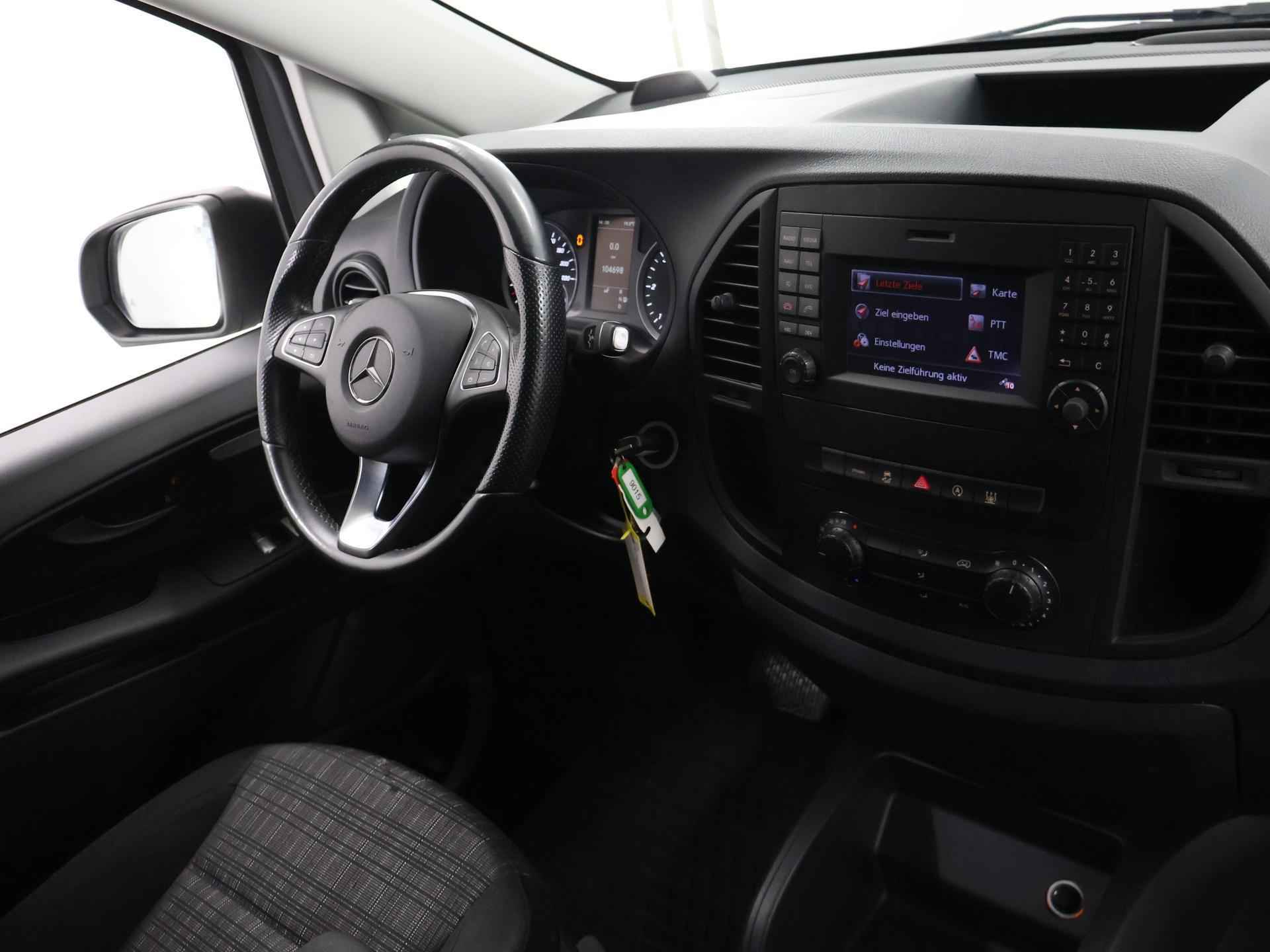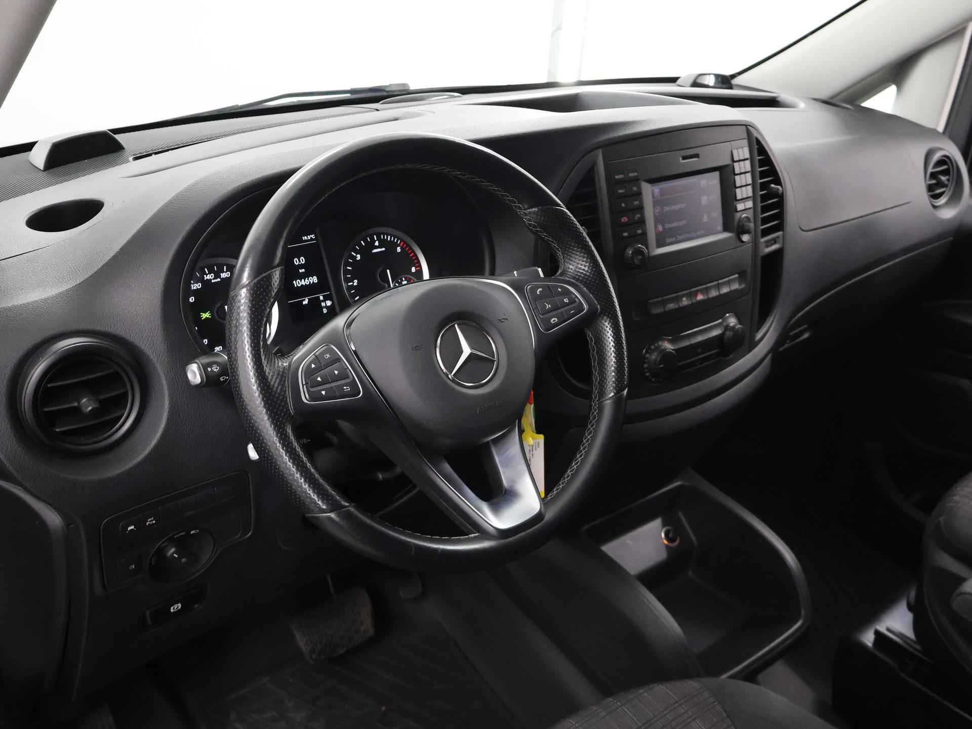 Typerend voor Duitse auto's als deze Mercedes-Benz Vito is dat een mooi ontwerp en uitstekende rijeigenschappen hand in hand gaan. De stijlvol getekende carrosserie verhult een state-of-the-art techniek, motorisch laat deze auto niets te wensen over en het weggedrag van de Vito is uitstekend. In deze auto vindt u een dieselmotor en een automatische transmissie. Bestuurder en bijrijder krijgen een warm welkom: deze Mercedes-Benz Vito is voorzien van verwarmbare voorstoelen. Een openzwaaiend portier kan flink wat wind vangen, met gevaarlijke gevolgen. Dat zal niet gebeuren met de handige, ruime schuifdeur. Ook 17 inch lichtmetalen velgen, LED koplampen, warmtewerend glas en trailer assistent horen tot de voorzieningen op deze auto. Kinderfietsje niet gezien bij het inparkeren? Dat gebeurt u nooit meer. Daar zorgt de achteruitrijcamera wel voor! Er is geen bestemming die het aanwezige navigatiesysteem niet kent. Dat rijdt lekker! Muziek aan, muziek uit? Het kan met een simpele vingerbeweging dankzij de audiobediening op het stuur! De elektronische systemen in deze Mercedes-Benz helpen u actief om comfortabeler te rijden. Een automatisch inschakelbare verlichting en een regensensor houden de omstandigheden onderweg in de gaten. Kilometers rijden met een exacte snelheid? Dan is de cruise control je vriend! En dan is deze auto ook nog eens voorzien van airconditioning, lederen stuur en centrale deurvergrendeling met afstandsbediening. Pragmatisch en veilig als deze auto is, beschikt hij over diverse veiligheidssystemen. De veiligheid van deze auto wordt verder verhoogd door dodehoekdetectie en bandenspanningcontrolesysteem. Even bellen voor een afspraak en u kunt deze auto van top tot teen zelf bekijken. Met vriendelijke groet, Hans Smeulders uw mobiliteitsadviseur bel; 06-23502761 tot ziens!
